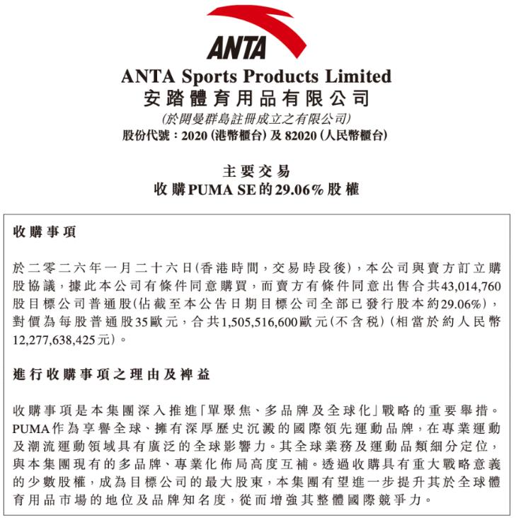 1月27日,安踏体育发布公告称,拟以15亿欧元(约123亿元人民币)收购彪马29.06%股权,成为这家德国运动品牌的最大单一股东。