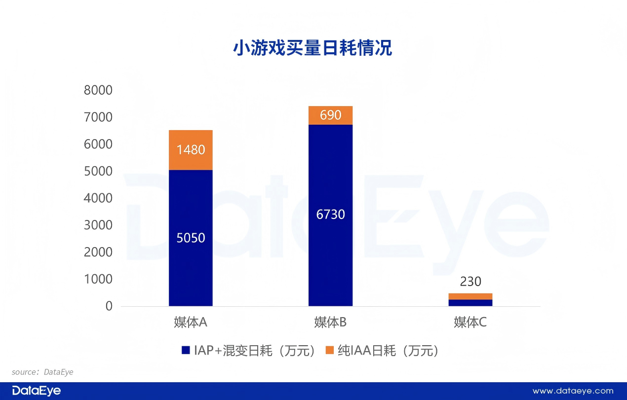 从日耗数据来看,小游戏直投买量日耗1.44亿。目前三大媒体平台的小游戏买量日耗较Q1增长约15.6%。IAA日耗约2400万,占消耗大盘约16.6%。IAA小游戏在三大主要广告平台直投日耗分别为1480万、690万、230万。