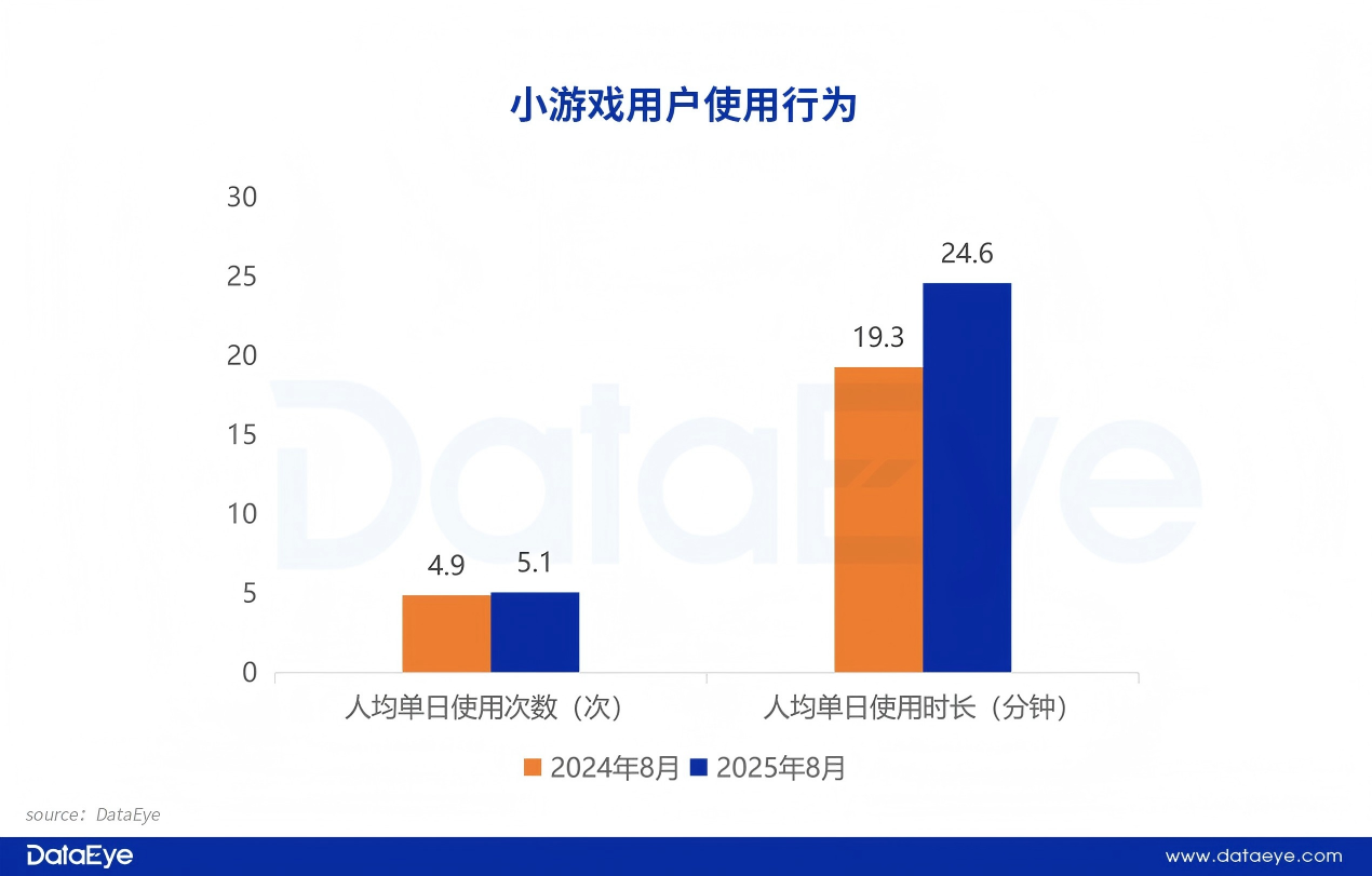 数据显示,小游戏行业人均单日使用次数约为5.1次,同比增长4.5%。此外,小游戏人均使用时长则提升至24.6分钟,同比增长27.2%。