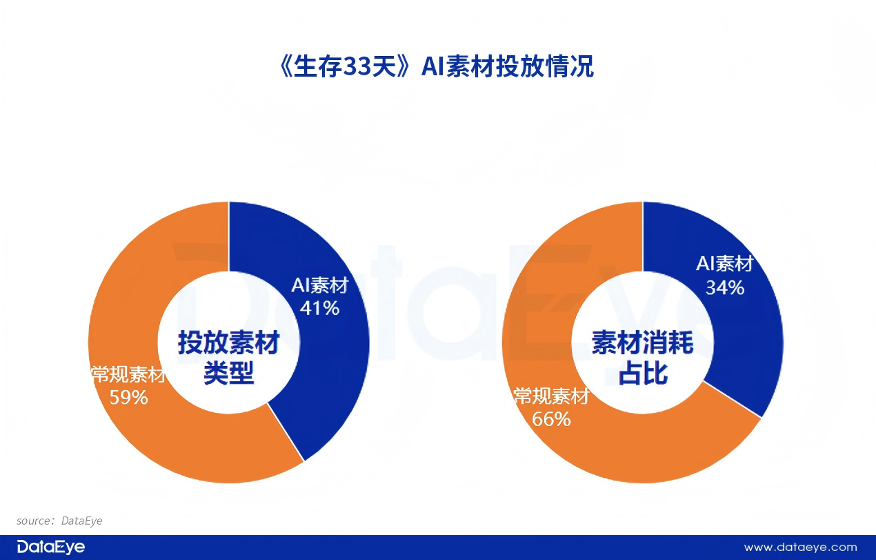 以三七互娱旗下小游戏《生存33天》为例。数据显示,2025年12月相关AI素材产量占比41%,而消耗占比34%。