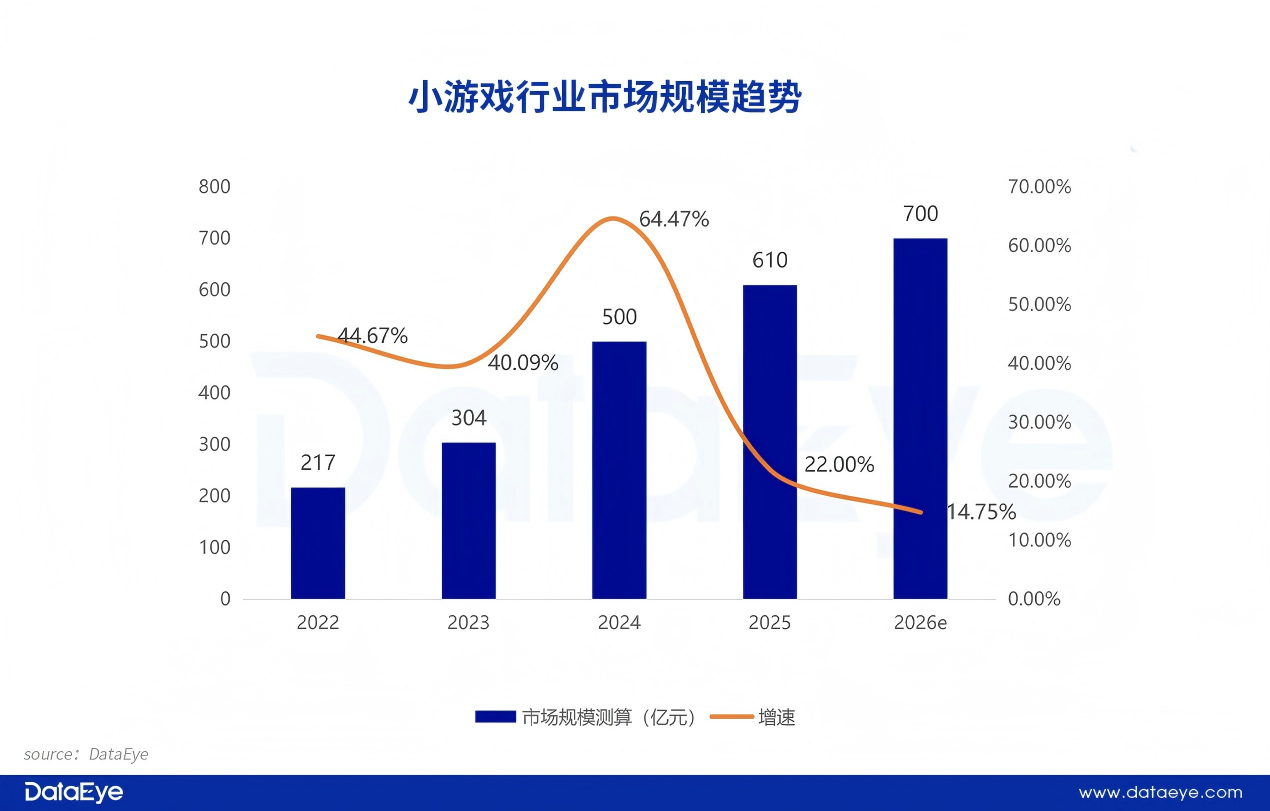 DataEye研究院测算数据显示,2025年国内小游戏市场规模约为610亿,同比增长22%,展现出极强的市场活力。预计2026年小游戏市场规模突破700亿。