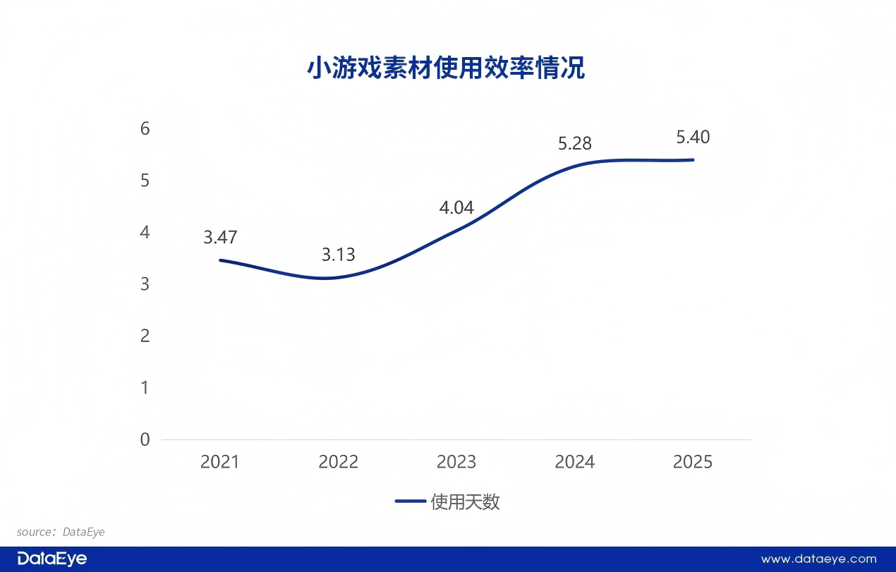 从投放素材使用效率来看,素材使用天数继续上涨,“拼数量”转向“拼质量。微信小游戏在2025年投放素材使用天数约为5.4天,同比增长约2.3%,整体趋于稳定状态。