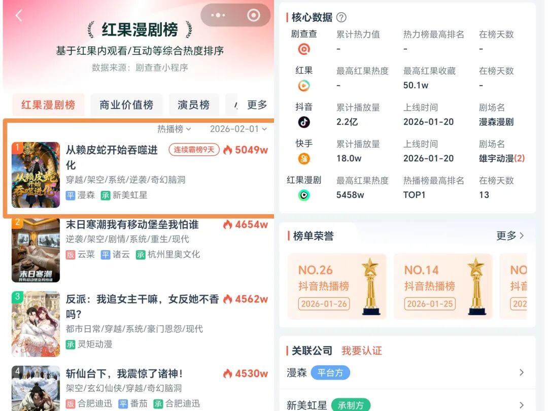 总体来看,这些爆款漫剧的主线都是从不被看好的底层“弱兽”通过一步步的升级系统任务,进化为顶级圣兽,共性的底层逻辑依旧是逆袭爽感。值得关注的是,1月20日上线的《从赖皮蛇开始吞噬进化》同时登上双榜榜首,抖音端原生播放总量超2.2亿,峰值热度达5458W。