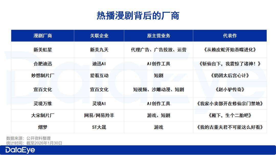 例如,曾经以AI工具为主要业务的灵境万维和迪迅,以游戏业务为主的网易和ST大晟,以及以广告代理和MCN为主要业务的新美九天等都是2025年下半年以来在漫剧赛道表现出色的“跨界”厂商。