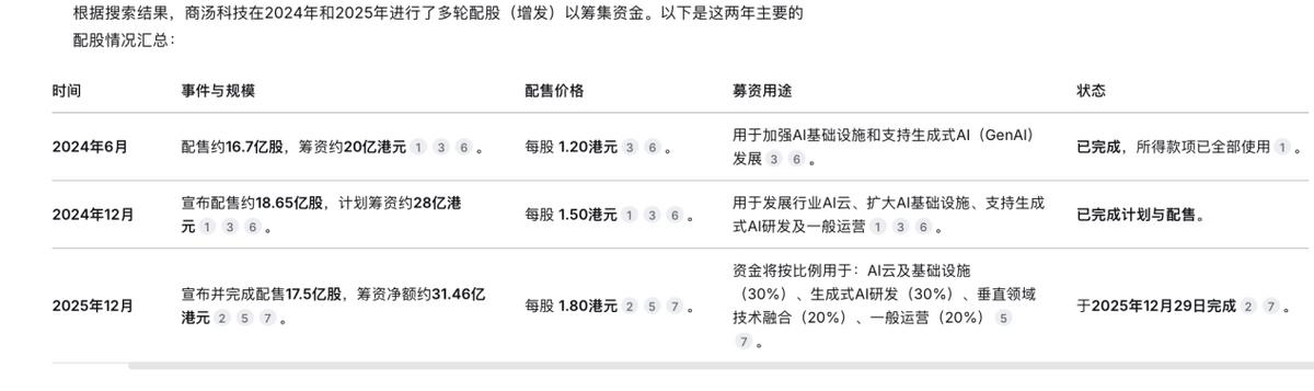 用DeepSeek盘了一下,2024年到2025年商汤科技做了三次增发,总筹资金额可能超过79亿港元。