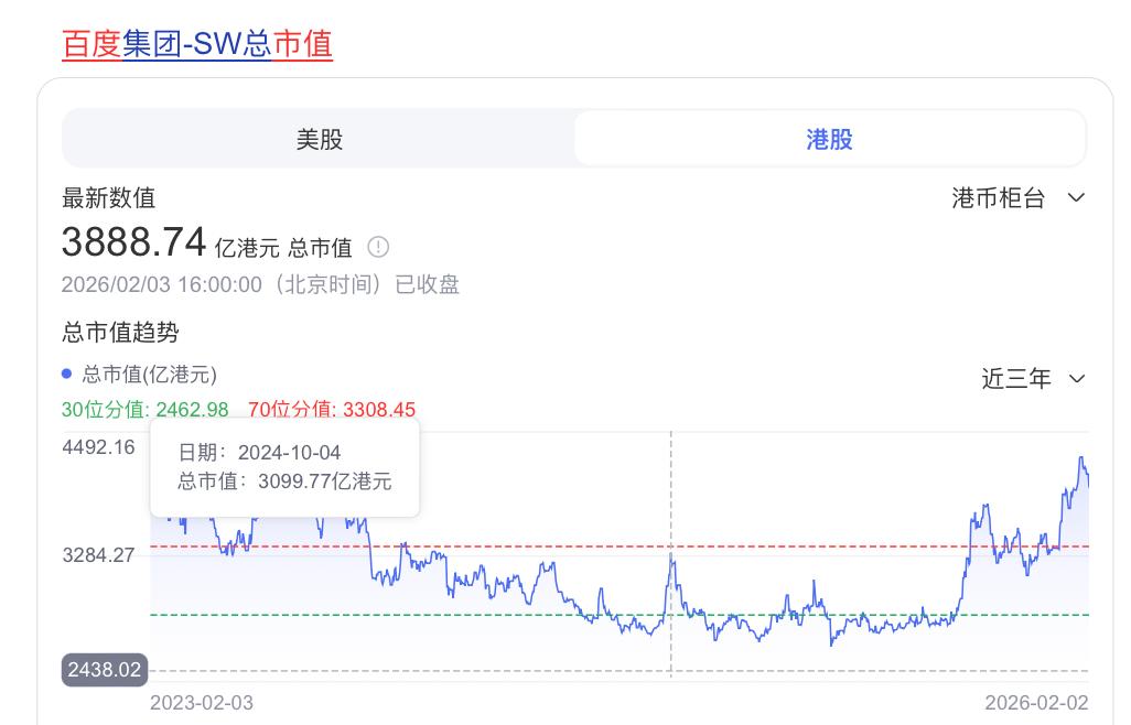 再来看同时期的百度,2024年10月初的高点,百度市值约为3000亿港元,现在,百度市值接近4000亿港元。