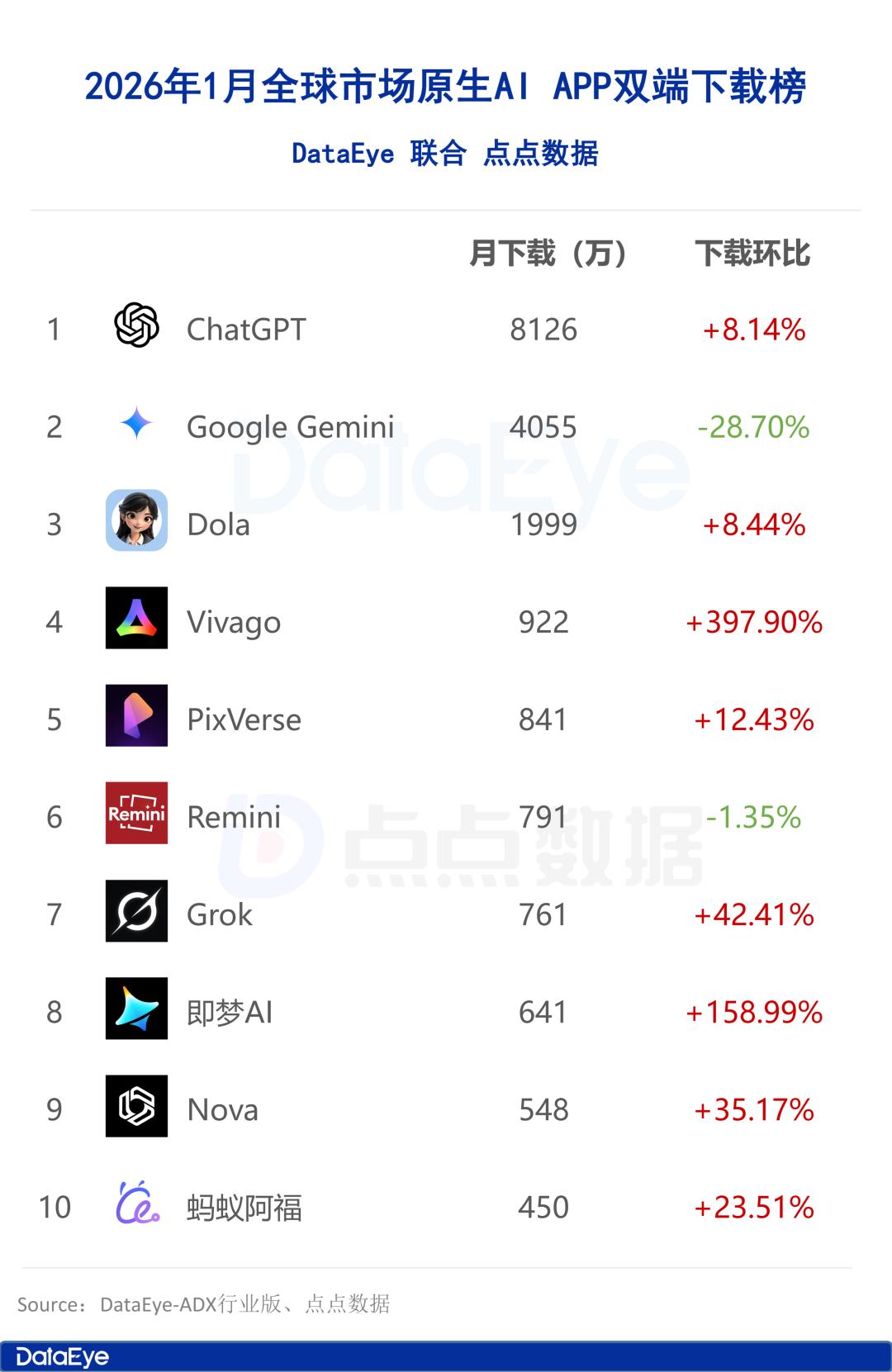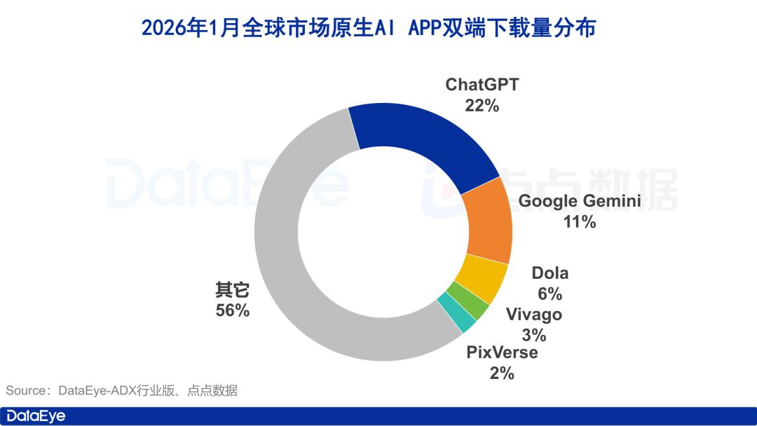 点点数据显示,2026年1月全球市场原生AI APP双端下载榜由ChatGPT蝉联榜首,下载量8126万次,环比去年12月上涨了8.14%,Google Gemini紧随其后,下载量4055万次,环比下滑了28.70%,豆包海外版Dola位列第三位,下载量1999万次,环比上涨8.44%。除这三款产品外,榜单其它产品下载量均不足千万次。
