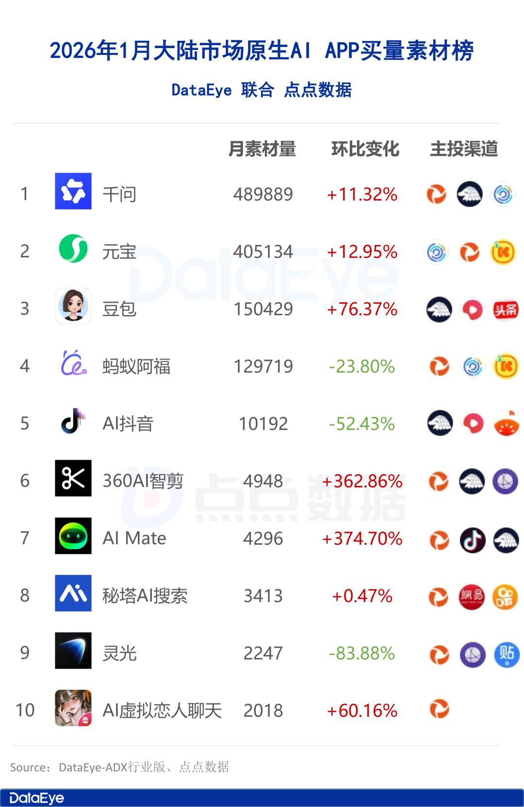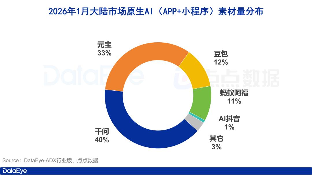 其中千问、元宝、豆包、蚂蚁阿福和AI抖音位列TOP 5,这5款产品占据了大陆市场原生AI产品月投放素材量的97%。