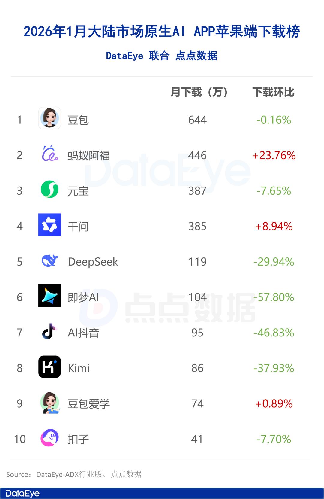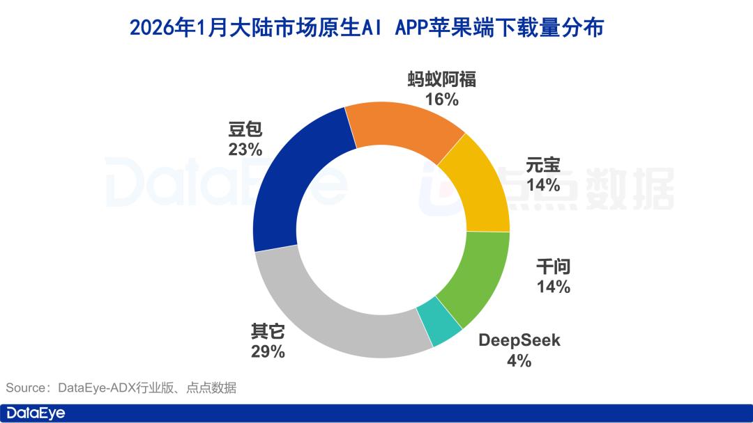 点点数据显示,2026年1月大陆市场苹果端原生AI APP下载量榜单由豆包占据榜首,下载量644万次,环比微跌0.16%;蚂蚁阿福、元宝和千问紧随其后,下载量分别为446万次、387万次和385万次,其中蚂蚁阿福环比上涨23.76%,超越元宝成为榜单第二位,以上四款产品位列第一梯队。
