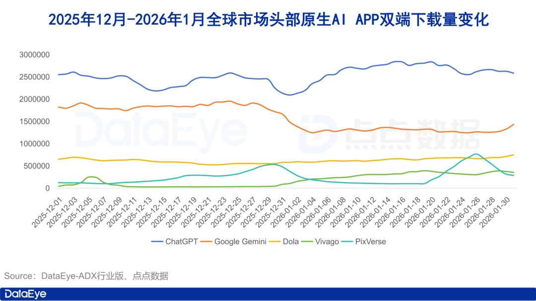 点点数据显示,2025年12月至2026年1月,全球市场头部原生AI APP中,ChatGPT双端预估下载量大幅领先同类产品,Google Gemini紧随其后,虽然其在1月份下载量明显下滑,但依旧明显高于其它产品,另外三款产品下载量相对差距不大。