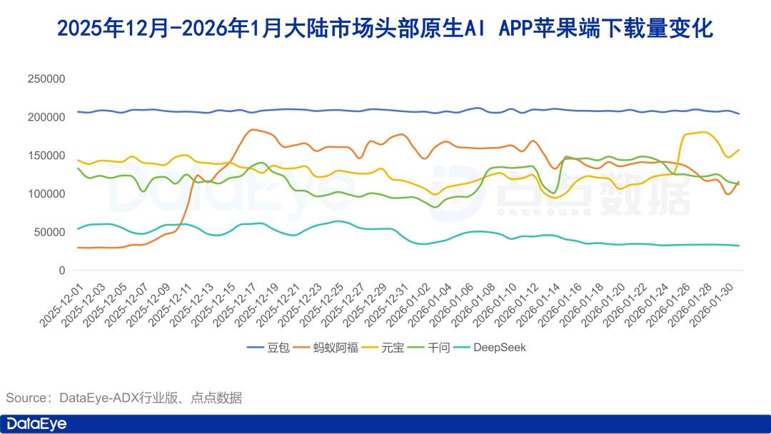 点点数据显示,2025年12月至2026年1月,大陆市场苹果端头部AI APP中,豆包预估下载量依旧保持领先,日下载量持续稳定在20.8万次左右。