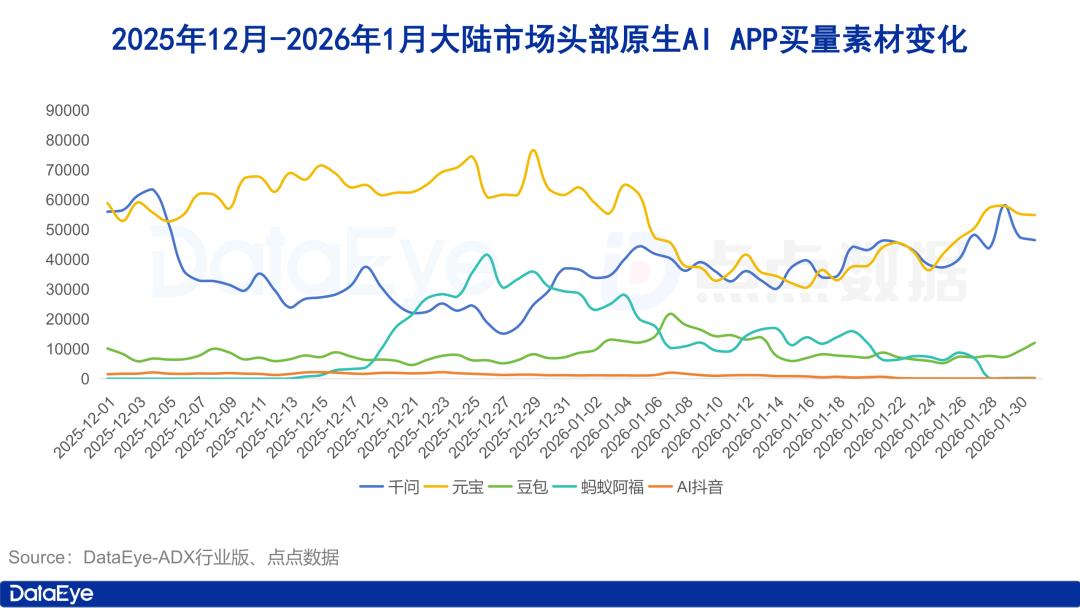ADX行业版数据显示,2026年1月,大陆市场头部原生AI APP中,千问及元宝素材量明显较高,且自1月中旬起,两款产品素材量走势较为接近,日投放素材量由1月10日左右的3.5万组左右上涨至1月底的高点5.8万组左右。