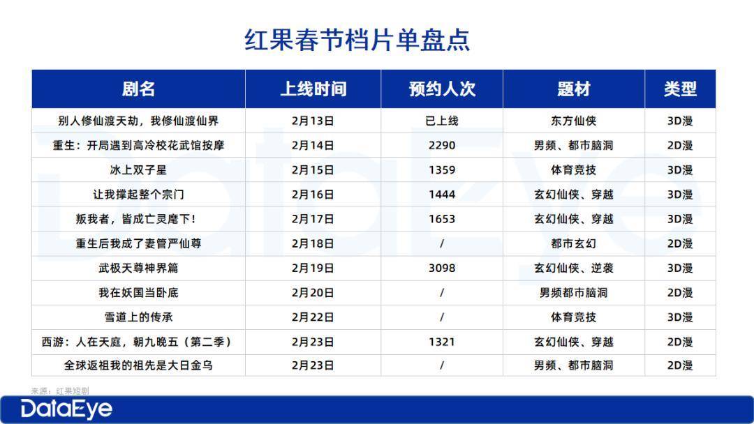 流量红利的背后,是内容品质的提升。DataEye数据显示,春节档头部精品漫剧抢占了行业90%以上的流量,行业正从“数量竞争”向“质量竞争”转型。