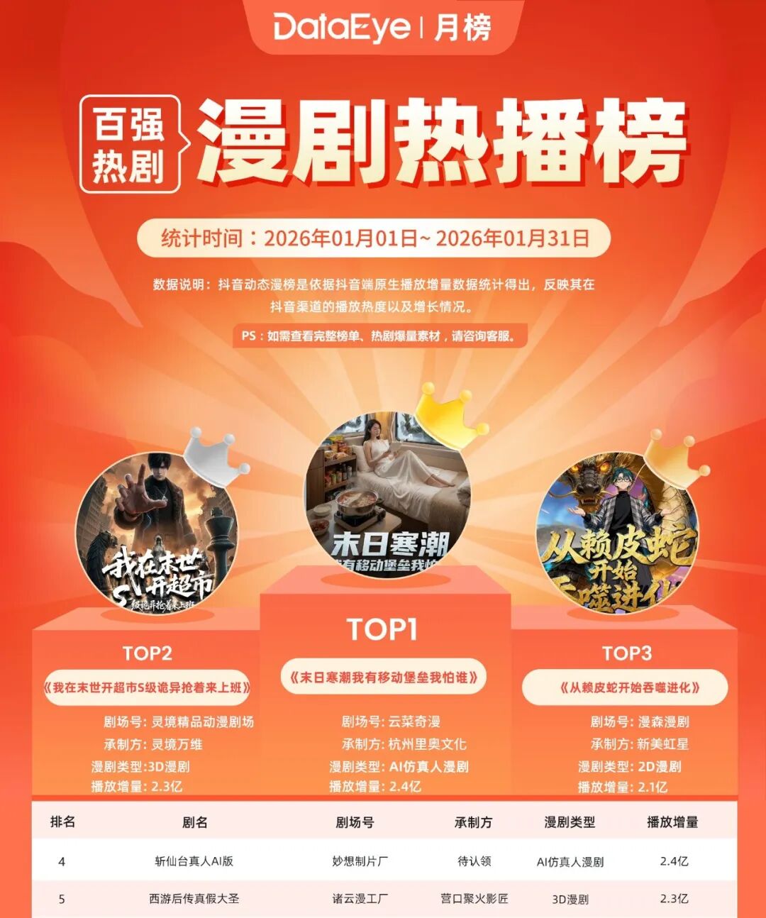 值得关注的是,承制方杭州里奥文化和新美虹星仅凭1部漫剧,单月播放增量闯入TOP5。杭州里奥文化承制的AI仿真人漫剧《末日寒潮我有移动堡垒我怕谁》1月播放增量达2.37亿;新美虹星承制的2D漫剧《从赖皮蛇开始吞噬进化》1月播放增量达2.13亿。