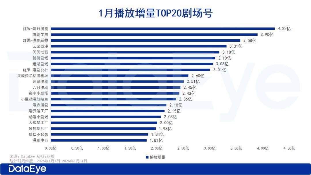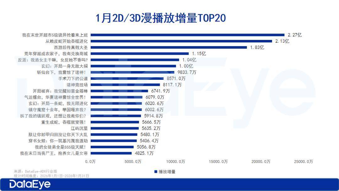 从1月抖音端原生漫剧的播放增量来看,总榜播放增量TOP1的是 AI仿真人 漫剧《 末日寒潮我有移动堡垒我怕谁 》1月16日在剧场号“ 云菜奇漫 ”上线,累计播放增量达2.4亿; 3D漫剧《 我在末世开超市S级诡异抢着来上班 》第 二,1月1日 在剧场号“ 灵境精品动漫剧场 ” 上线,1月播放增量达2.3亿; 2D漫剧《 从赖皮蛇开始吞噬进化 》第三,1 月20日在剧场号“ 漫森漫剧 ”上线,累计播放增量达2.1亿,是1月破2亿最快的漫剧。