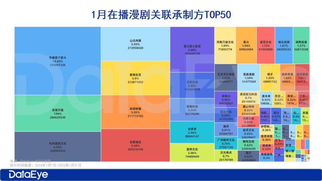 (百强榜详细解读:1月漫剧百强榜:云菜、灵境万维、漫森文化领跑!AI仿真人漫占38%,女频漫剧大幅增长!)