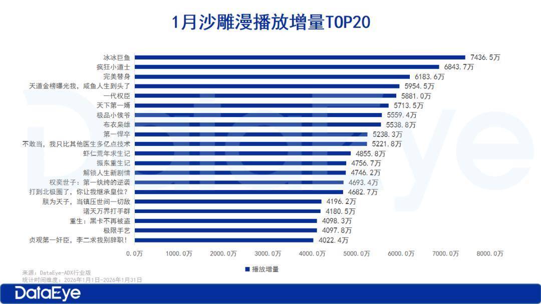 沙雕漫的TOP20播放量级明显偏低,最高作品《冰冰巨鱼》仅7436.5万。TOP20作品播放增量均在4000万-7500万之间,用户粘性高但播放天花板有限。