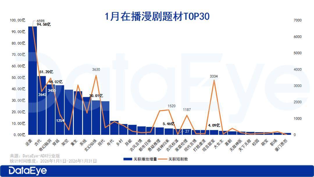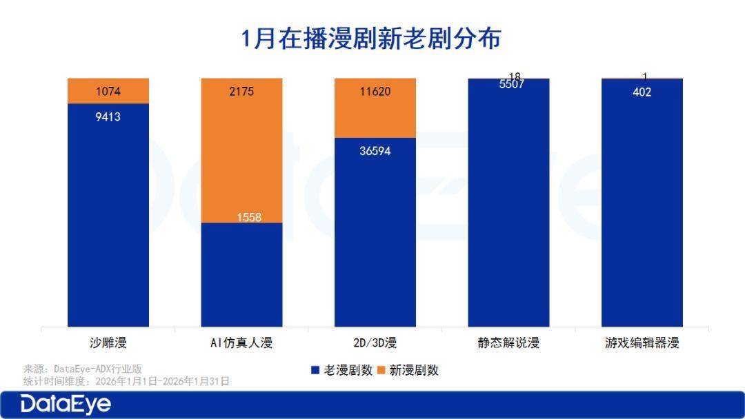 根据DataEye-ADX行业版数据显示,2026年1月在播的漫剧总数达68157部(含2024年上线并持续在播剧目),市场供给充足。1月总体的播放增量达251.57亿,其中新上线漫剧的播放增量达141.7亿,占1月总体播放增量的56.33%。