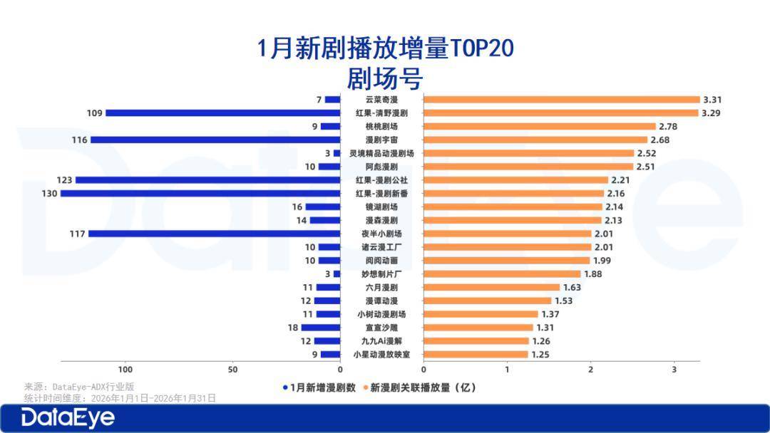 从市场反响来看,在播漫剧中,共有14部数漫剧播放增量超1亿,其中TOP3均超2亿,3部2亿漫剧均是本月新上线的漫剧。在播放增量TOP10的剧场号中,有7个剧场号的播放增量主要由1月新上线漫剧贡献。