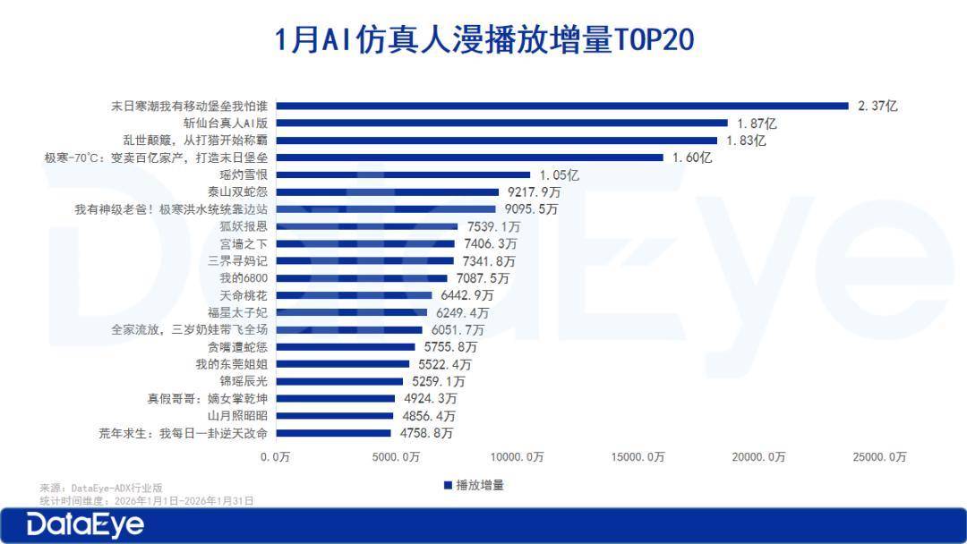 AI仿真人漫头部作品播放增量断层领先,《末日寒潮我有移动堡垒我怕谁》以2.37亿播放量领跑,TOP3作品播放增量均超1.6亿,TOP20中多部作品破亿,整体量级远超其他类型。