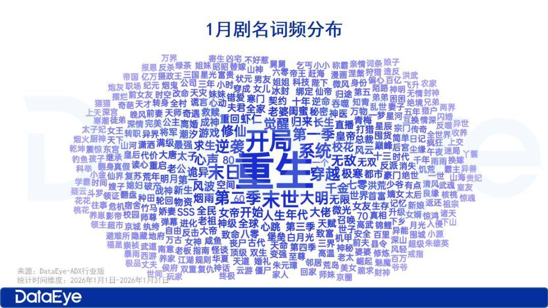 从本月热播漫剧的剧名词频来看,“重生”“开局”“系统”“逆袭”“无敌”等题材 高度关联的词汇 高频出现,与逆袭题材播放量断层领先的市场表现高度呼应,证明“爽点前置”的剧名策略是当前最有效的流量获取方式。但也 反映出漫剧内容在核心爽点元素上的高度同质化。创作者扎堆在 “流量词”,导致剧名同质化严重,用户审美疲劳,大量作品陷入“名字相似、内容雷同”的困境;