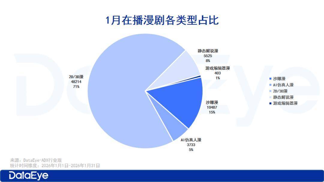从漫剧类型来看,1月漫剧市场上在播的漫剧类型以2D/3D漫为主,占比达71%,共48214部,仍是行业最成熟的内容形态。其次是沙雕漫剧占比达15%,解说漫占比达8%,这两类内容依赖成熟的制作模式和用户基础,形成了稳定的存量盘。