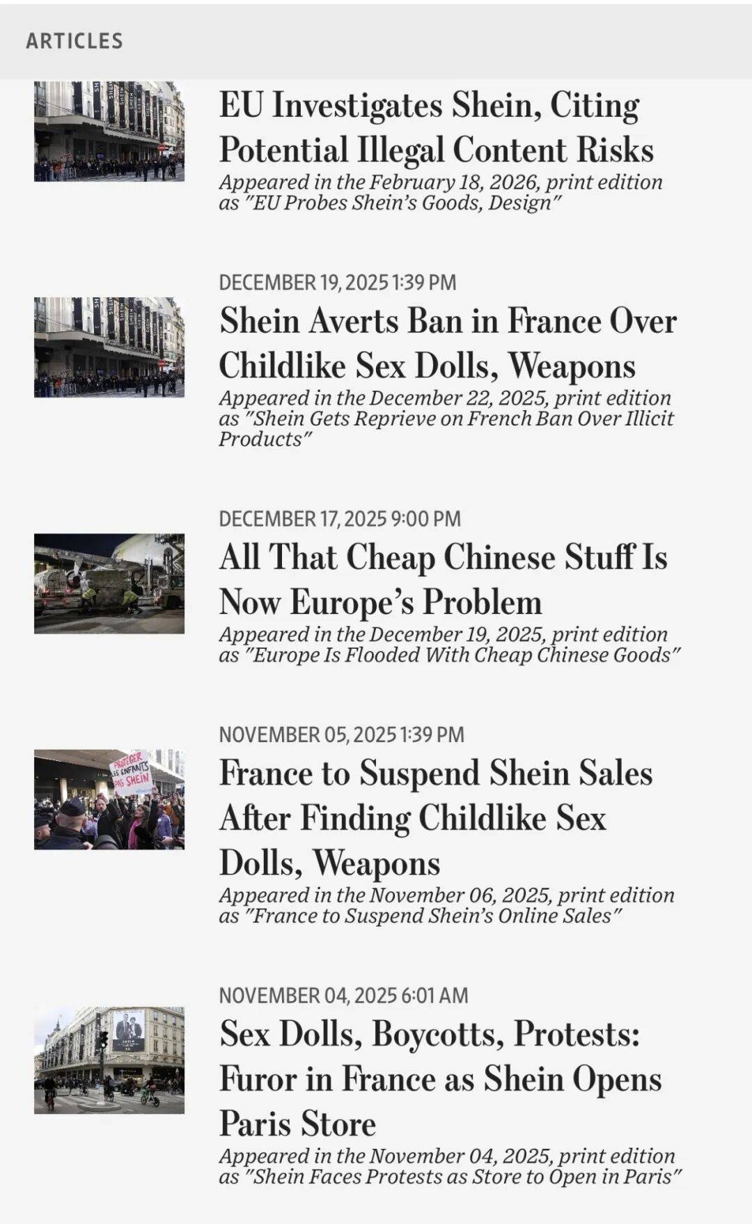 翻看西方主流媒体《华尔街日报》对SHEIN 的报道,一系列的标题明显带节奏,比如《Shein 因出售儿童性玩偶被欧盟调查》,把一起商家违规事件,放进了“欧洲面对中国廉价商品” 的宏大叙事里。
