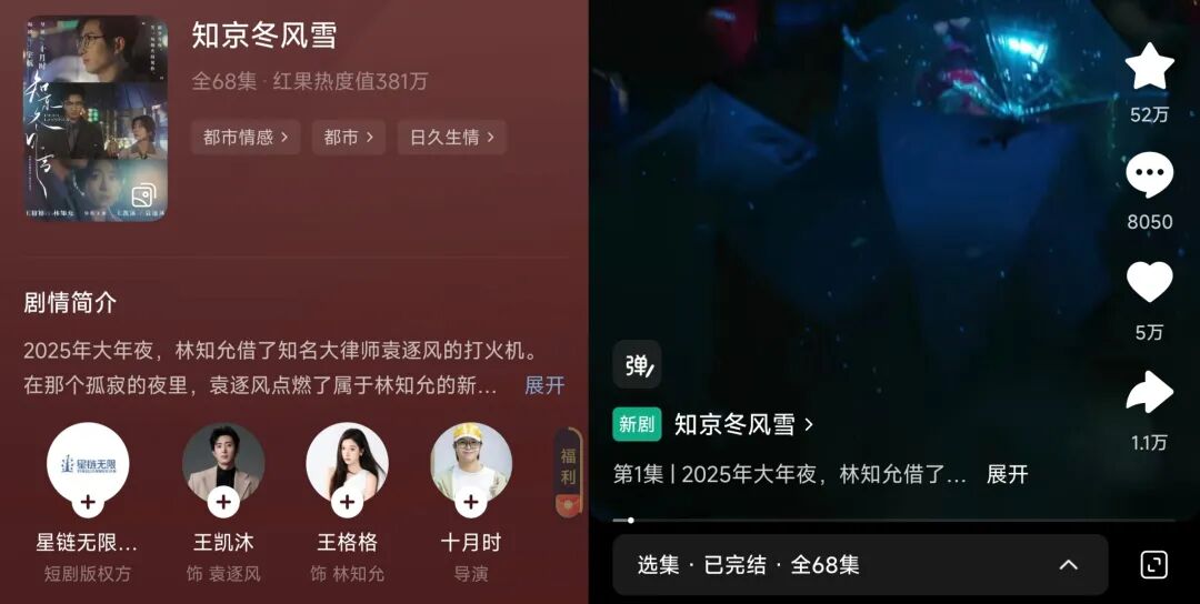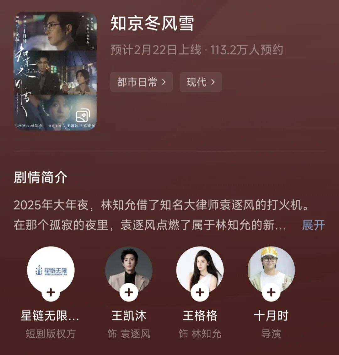 据红果数据,《知京冬风雪》上线前在红果预约量超110W。