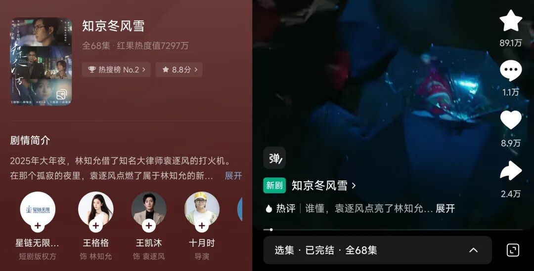 《知京冬风雪》于2月22日上线,处于春节流量高潮后的余热期,在瞄准了温暖叙事的市场缺口的同时,也避免了与其他热播剧的正面竞争。