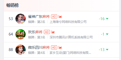 对比来看,麻将品类产品表现更为明显。从统计时间为2月16日-2月22日的榜单表现来看,在榜的三款麻将品类产品均出现环比下滑的情况。