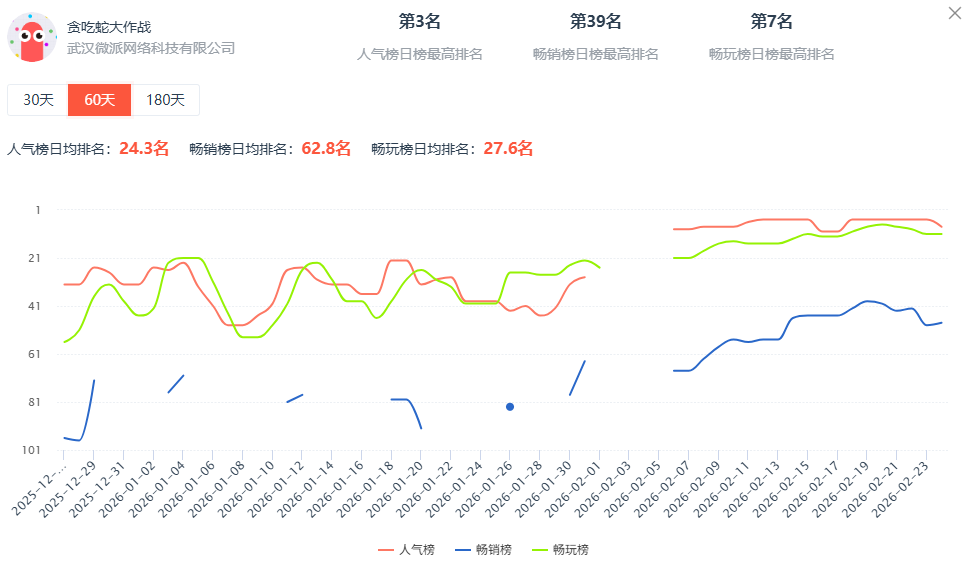 所以我们可以看到,例如《贪吃蛇大作战》则是在春节档表现稳定。因为在此之前,该游戏在微信小游戏畅销榜排名波动较大。