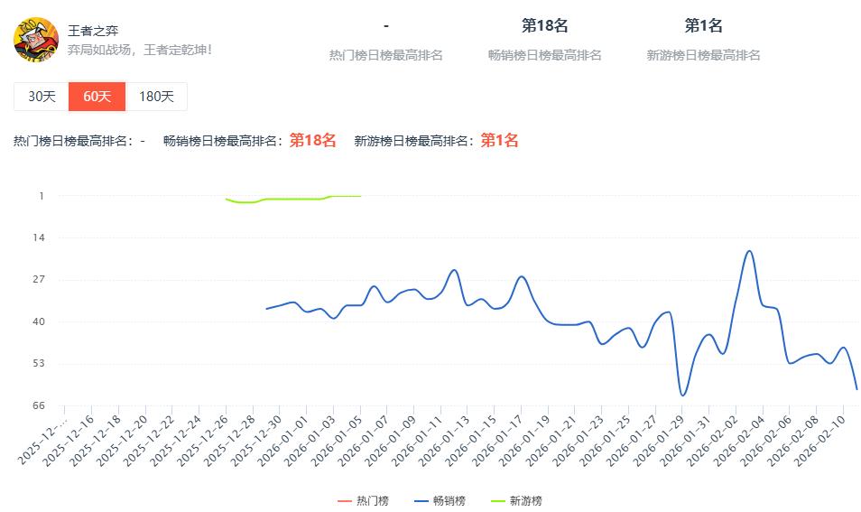 《王者之弈》在去年12月26日就进入了抖音小游戏榜单,并且在新游榜排名TOP3。而在去年12月29日进入畅销榜排名。进入2月后,《王者之弈》抖小端活跃,排名最高升至第18名,然后也出现快速滑落的情况。