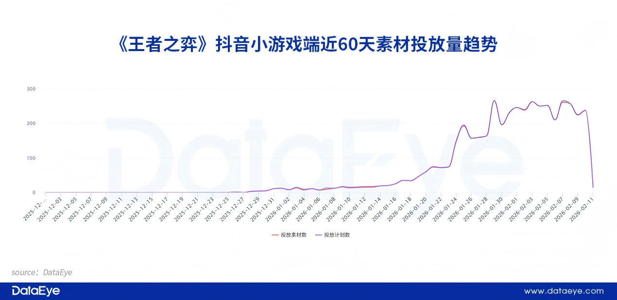 DataEye-ADX数据显示,《王者之弈》微信小游戏端在去年12月28日就开始进行投放,并且整体投放量级符合中腰部产品定位,日均投放素材量在200条以内,投放策略以性价比为核心,并没有进行盲目的大规模投放。
