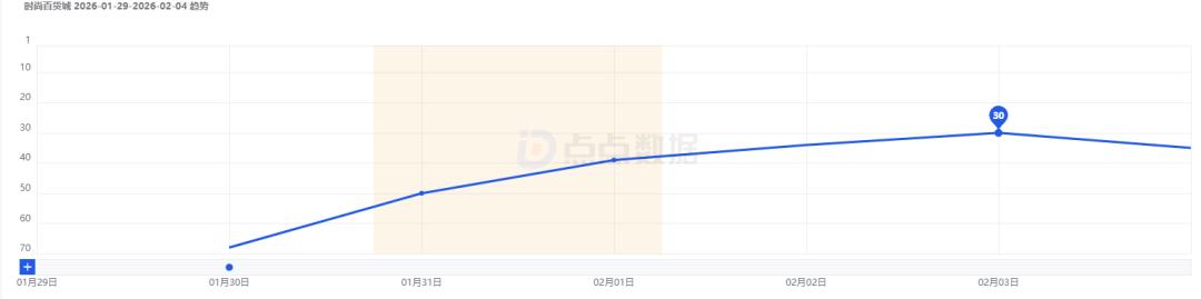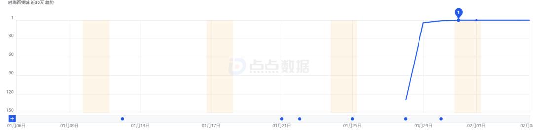 点点数据显示,《时尚百货城》iOS端在1月28日完成产品上线,而当天iOS免费榜排名仅为130名,而次日(1月29日)排名突然冲入榜单TOP5。随后《时尚百货城》排名再度提升,在1月31日完成iOS免费榜登顶。截至2月3日,《时尚百货城》连续4天霸榜iOS免费榜。