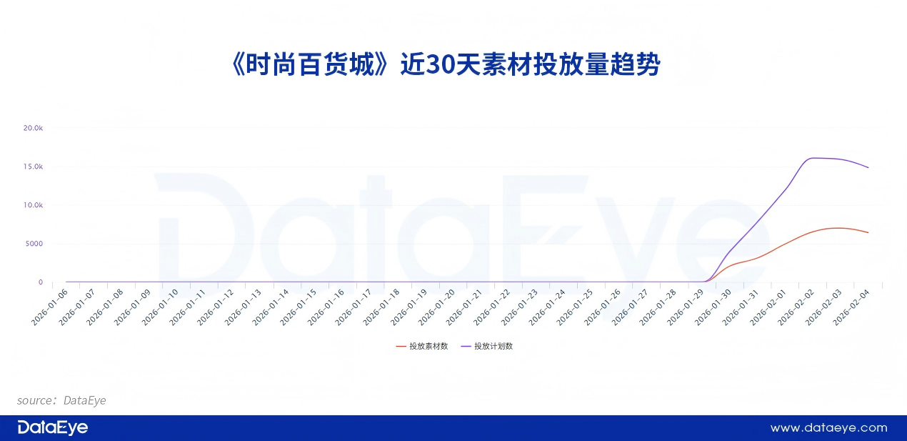 DataEye-ADX投放数据显示,《时尚百货城》在产品上线并没有进行任何测试及预热素材投放,直到1月30日才进行买量投放。