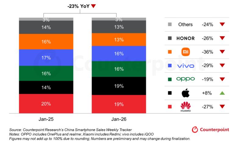 前不久,机构Counterpoint Research 发布了中国智能手机周度销量追踪报告,数据不太好看。今年1月,中国智能手机销量同比下降23%,大多数国产品牌都遭遇了两位数的下滑幅度,只有苹果保持了同比正增长。