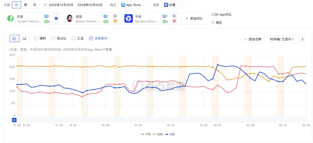 点点数据显示,3款APP(去年12月20日—今年2月20日)iOS累计下载量:豆包1243万位居第一,元宝886万紧随其后,千问853万略逊一筹;每日变化如下图,可以看出,豆包在节前较为稳健,日均下载20万+,但地位确实短暂被“撼动”。元宝借助春节红包打法于春节期间反超豆包,表现出强劲实力。千问也同样在春节期间出现一轮高峰。
