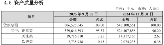 截至2025年三季度末,关注类贷款余额高达19,716,610千元,较2024年末增幅达39.49%,占比从2.63%升至3.25%。