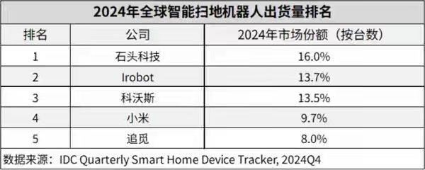 作为20多年前就入局扫地机的先行者,科沃斯凭借技术自研、全链条供应链布局和线上线下全渠道覆盖,快速实现规模扩张,常年稳居国内扫地机器人市场份额第一,成为行业绝对龙头。