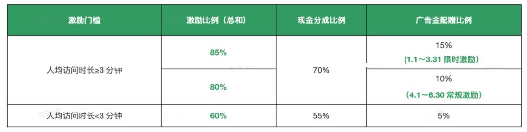 1月1日~3月31日期间,满足3分钟人均访问时长小程序按照70%现金+15%广告金分成,合计总分成85%;