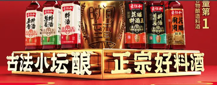 老恒和料酒“小坛飘香”符号:基于“160年纯谷物酿造+7亿陈年基酒储备”的核心优势,确立“年份至香”战略破局点,用“冒香气的小酒坛”符号可视化,传递“陈酿、鲜香”的核心价值,连续六年占据高端料酒市场第一。
