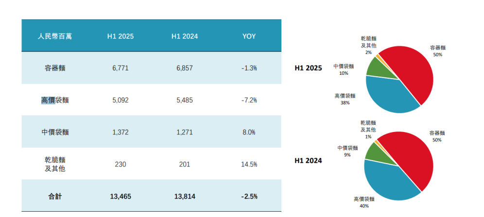 康师傅2025年上半年在营收下滑的逆境中,交出了净利润大涨20.5%的成绩单。其中,方便面业务销售额虽同比下滑2.5%,但净利润同比增长11.9%,毛利率提升至27.8%。