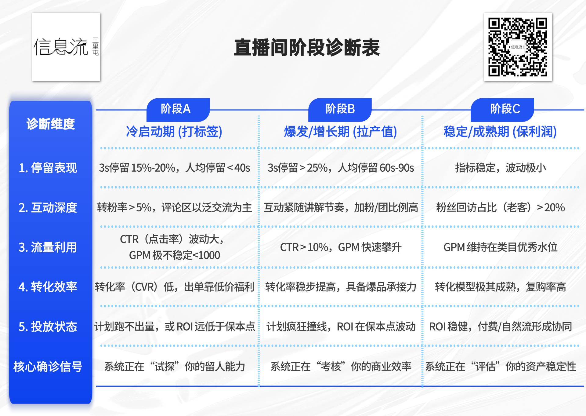 接到项目求助时,我让投手先别急着“怎么调整”,而是必须先给直播间做一次深度“体检”。很多投手之所以会犯“爆发期压出价”或者“冷启动期看ROI”的错误,本质上是因为没有通过量化指标,判断出直播间所处的真实周期。