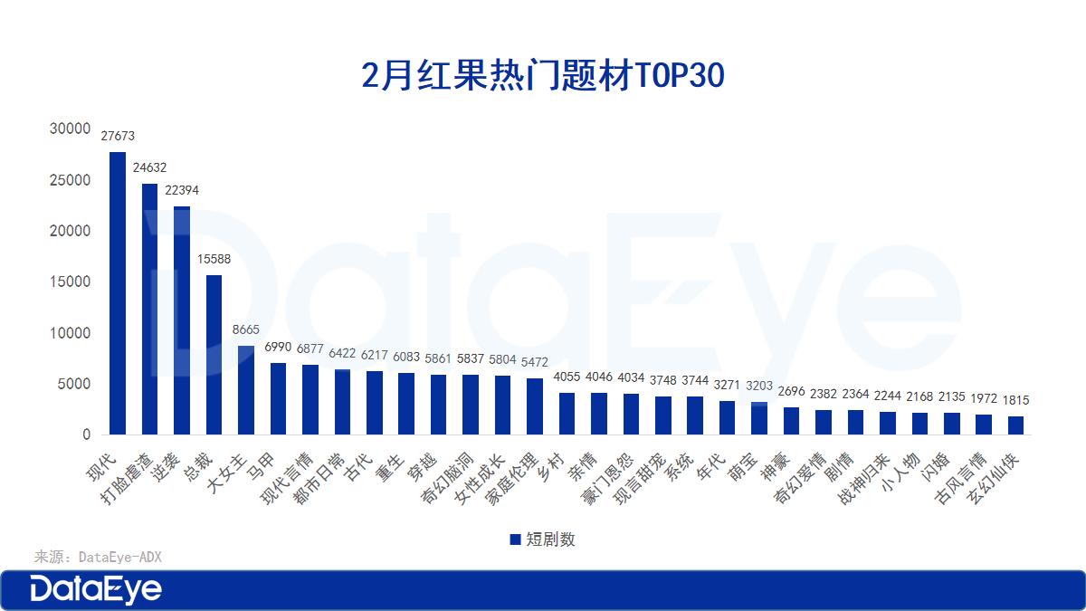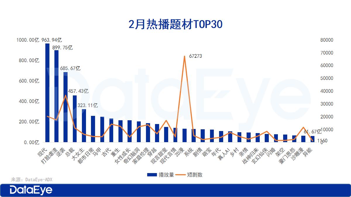 同时,在2月播放量大盘总体数据下滑的情况下,大女主题材反而有所提升。2月DataEye抖音端原生百强榜中,大女主题材微短剧关联播放增量占播放增量总额的31%。