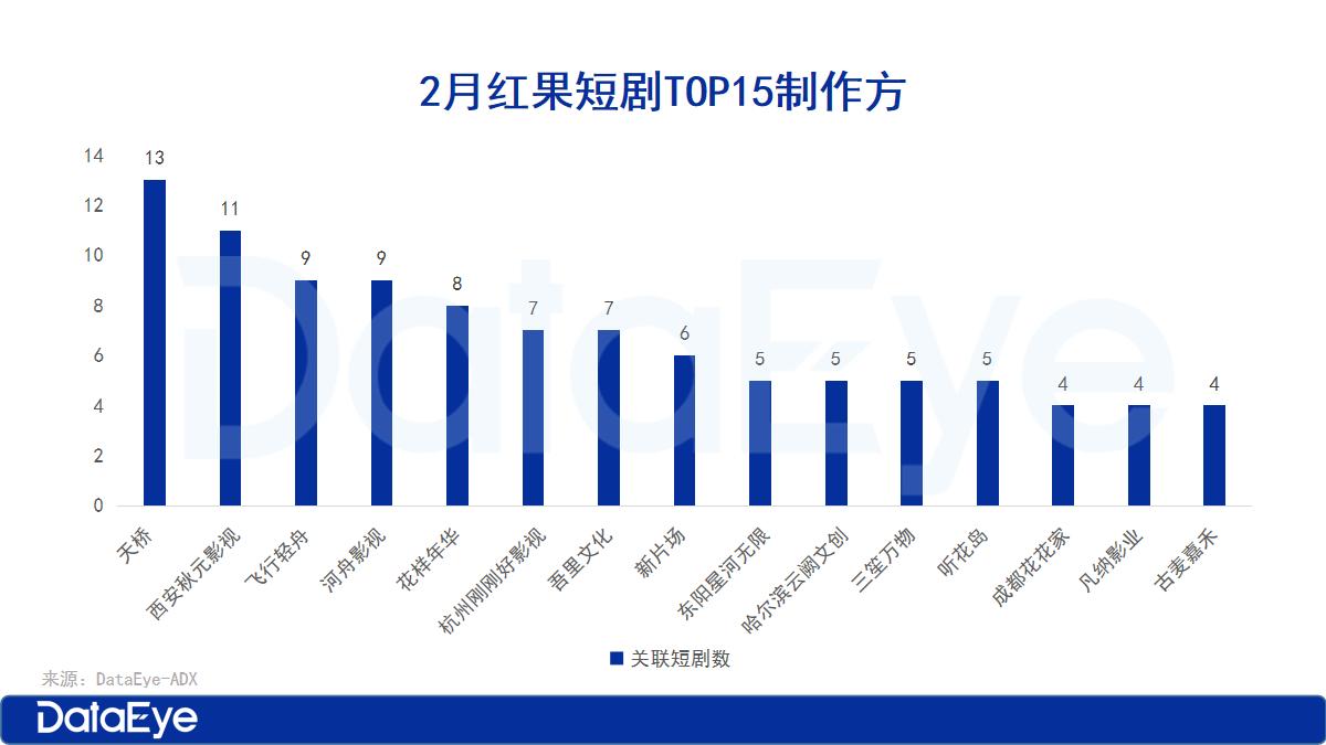 从制作方角度来看,2月,DataEye红果热榜月榜中,天桥制作的微短剧数达13部;西安秋元影视位列第二,关联微短剧数为11部;飞行轻舟与河舟影视均占9部,并列第三。