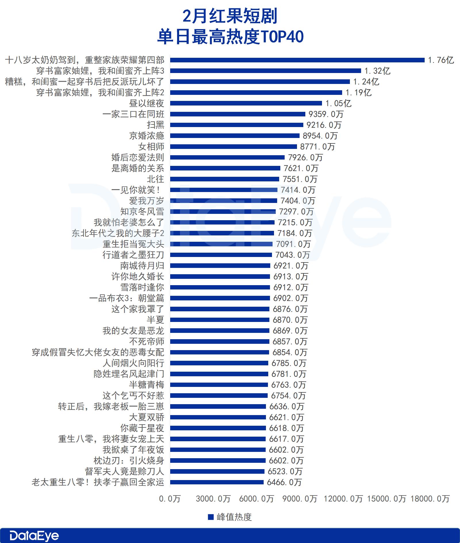 2月上榜的红果短剧中,共有9部微短剧热度峰值超8000W,5部微短剧热度峰值破亿。其中,榜首《十八岁太奶奶驾到,重整家族荣耀第四部》峰值热度达1.76亿,大幅领先。