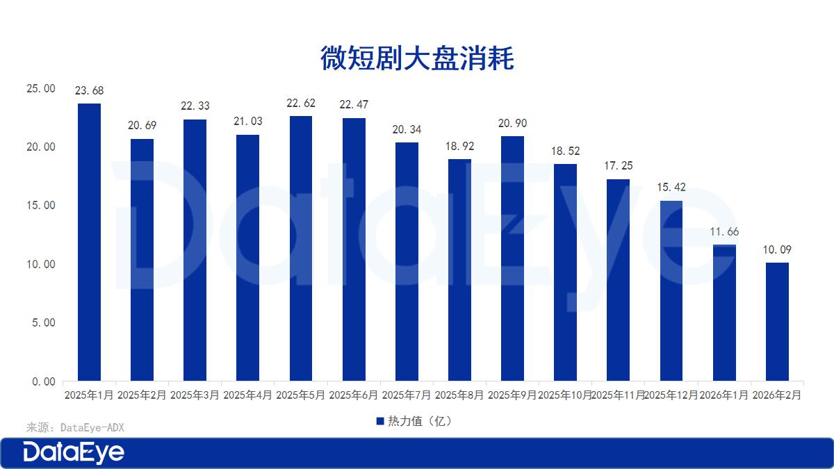 2026年2月,微短剧热力值达10.09亿,较上期下降13%,降幅较上期有所缓解。