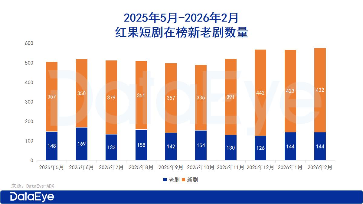 2月,红果短剧在榜剧共576部,较上期提升9部,变化较小。本期新剧达432部,占比达75%。