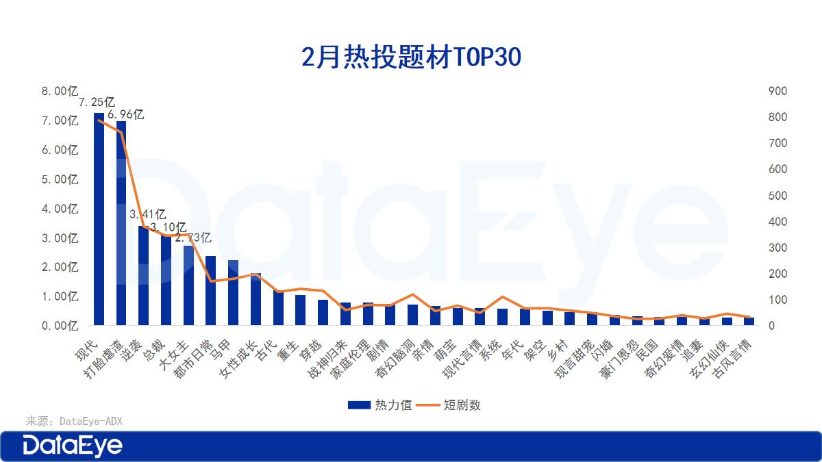 题材方面,2月热投题材中,共有10类题材关联热力值破亿,13类题材关联微短剧数破百。