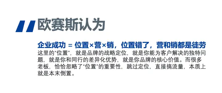 我在很多文章中都写过,欧赛斯有一个核心理论:“企业成功=位置×营×销,位置错了,营和销都是徒劳”。
